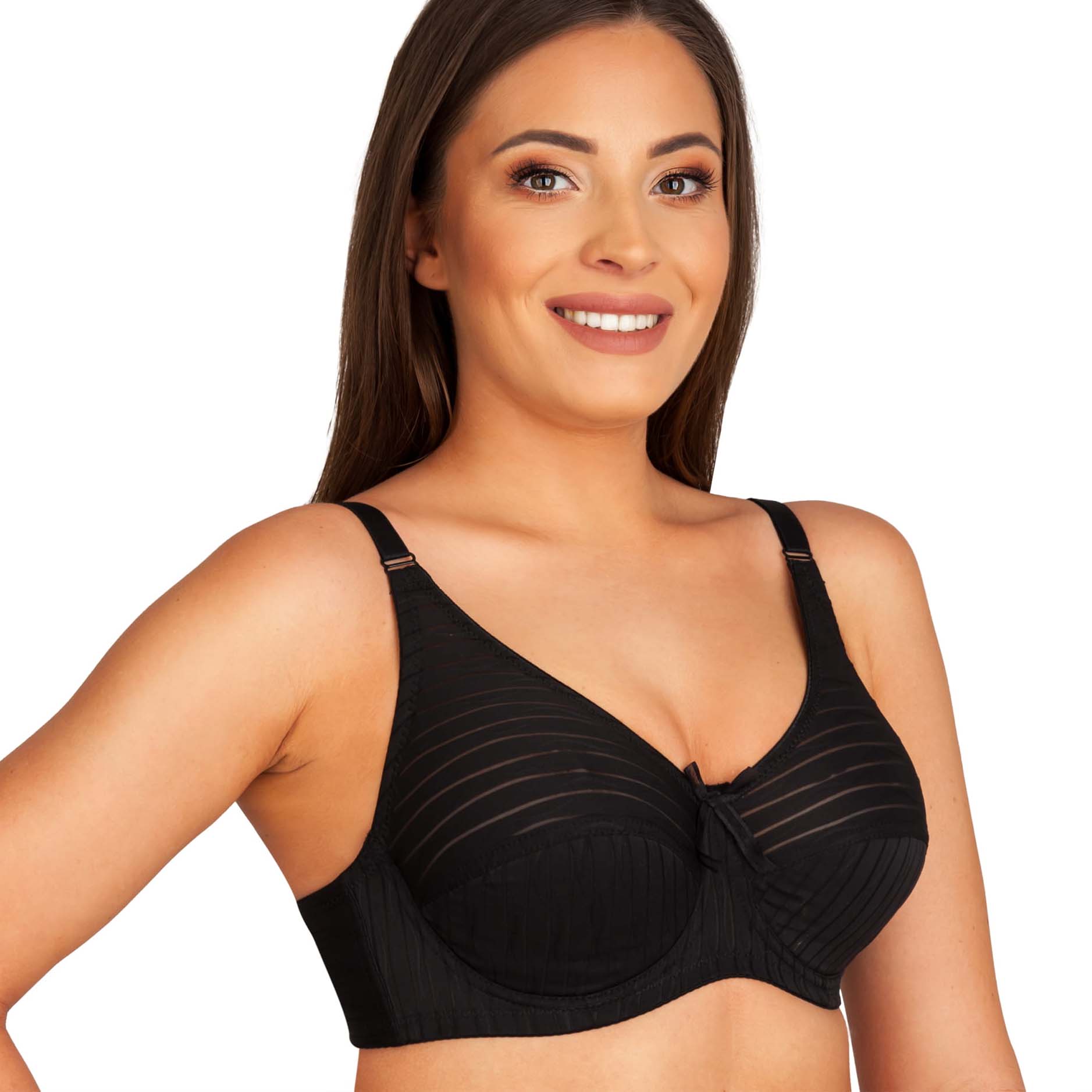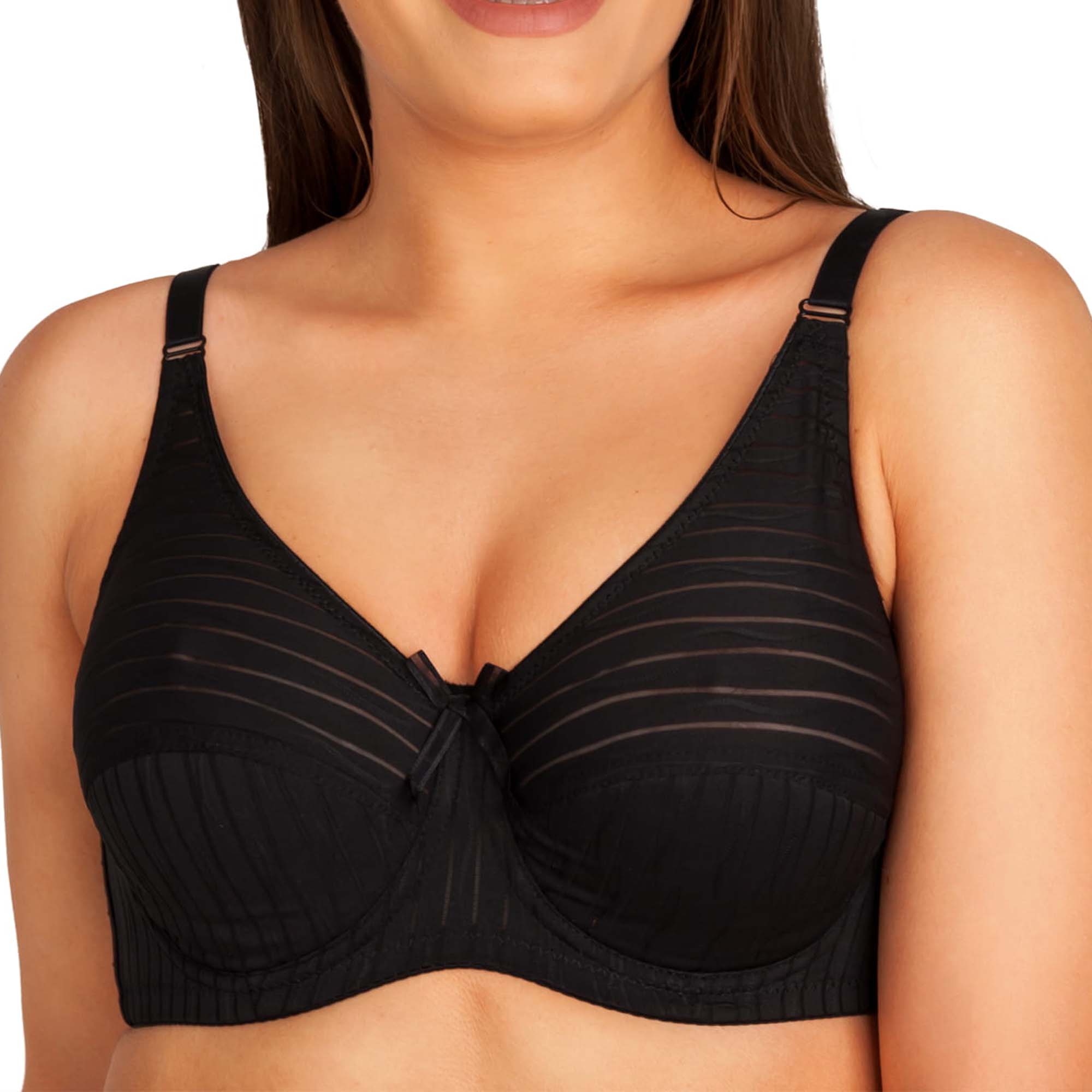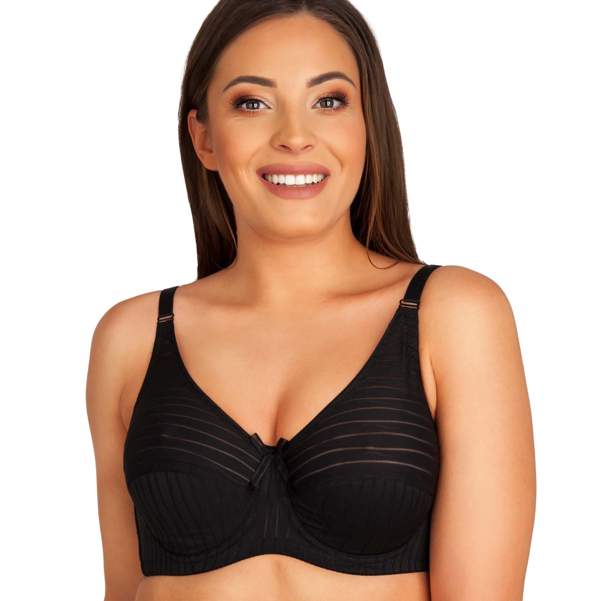 Model wykonany został z miękkiego, oddychającego materiału, który delikatnie otula skórę, zapewniając uczucie świeżości przez cały dzień. Kobieca stylistyka biustonosza podkreślona została subtelnym wzorem w delikatne paski, a urokliwa ozdoba na mostku dodaje mu niepowtarzalnego charakteru. Dzięki trzyrzędowemu zapięciu na potrójnych haftkach oraz szerokim, regulowanym ramiączkom, biustonosz można idealnie dopasować do sylwetki, co dodatkowo zwiększa komfort noszenia.